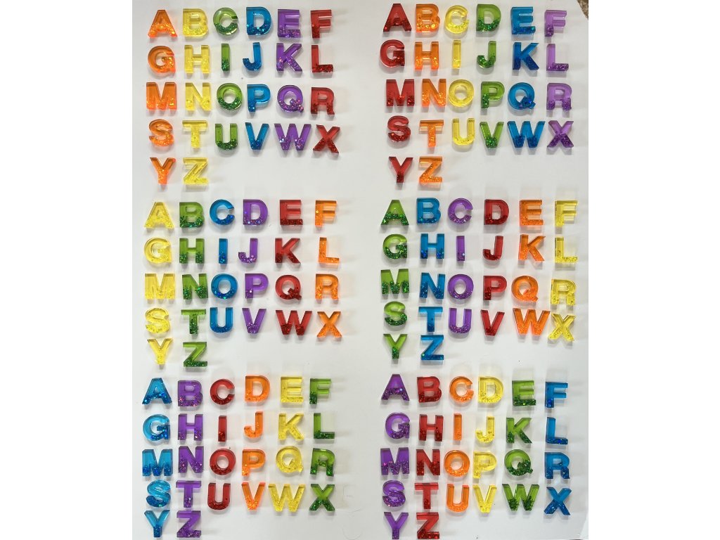 Tato hranatá nebo zaoblená abeceda z pryskyřice obsahuje 26 písmen.