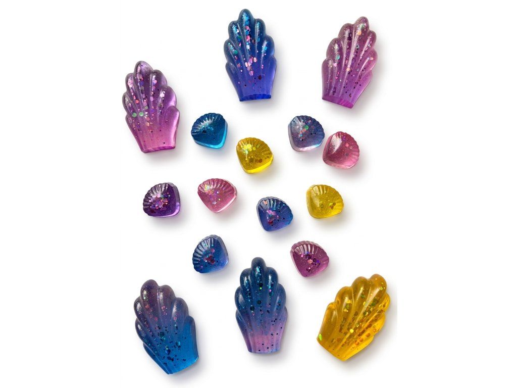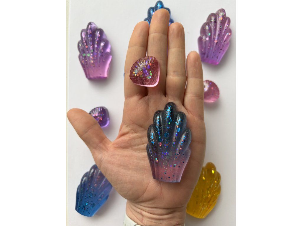 Velikost mušle z pryskyřice cca 2,5 cm, korál z pryskyřice cca 6,5 cm.